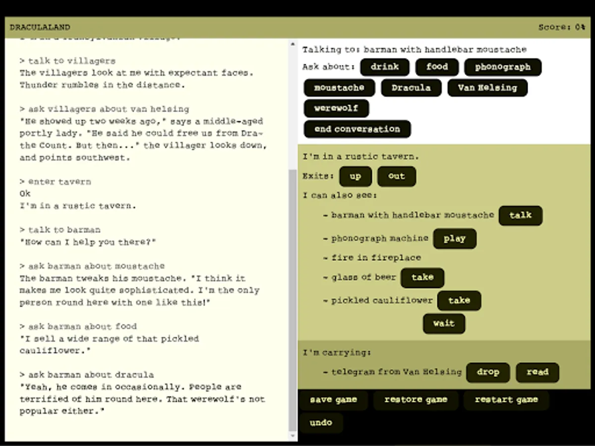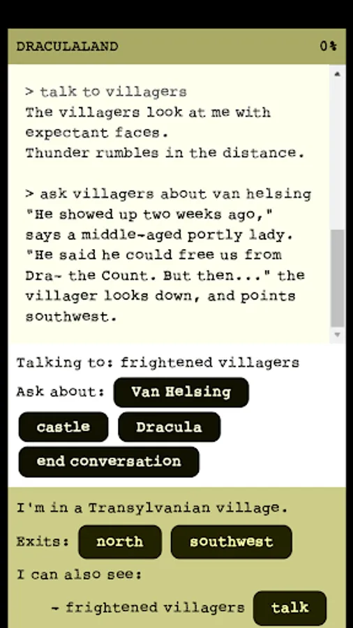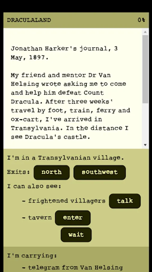Guide Jonathan Harker on a trip through Transylvania, interacting with vampires, mad scientists, zombies, annoying magpies, moustachioed werewolves, and ultimately Count Dracula himself! A text-based interactive fiction game based on Bram Stoker's classic.