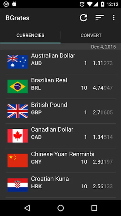 BGrates is an Android application that delivers up-to-date currency exchange rates for Bulgarian Lev (BGN). Convert function is also available. Exchange rate information is fetched from the web site of the Bulgarian National Bank. The BNB updates exchange rates on a daily basis.
