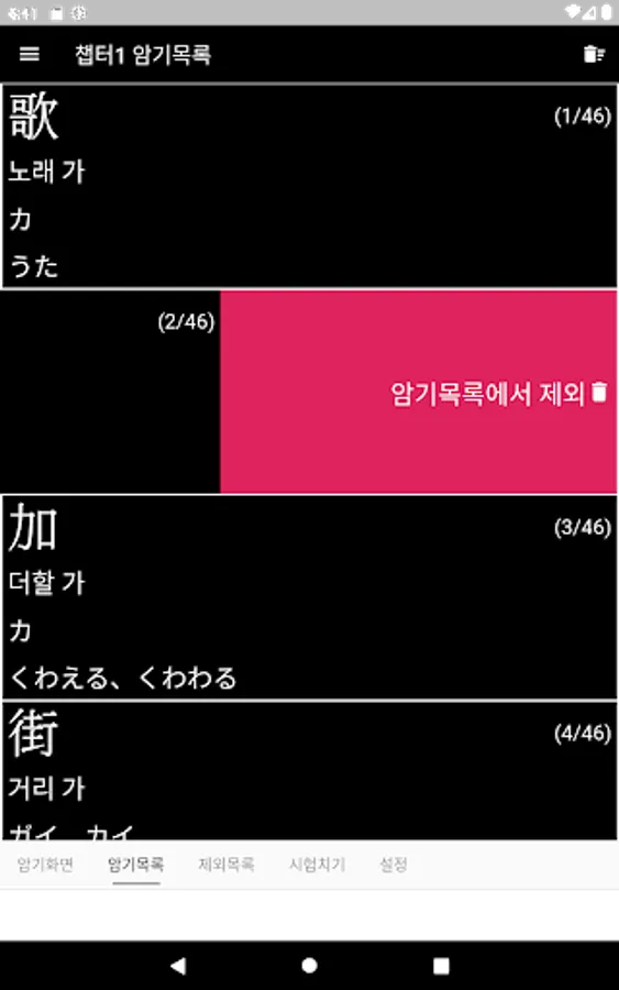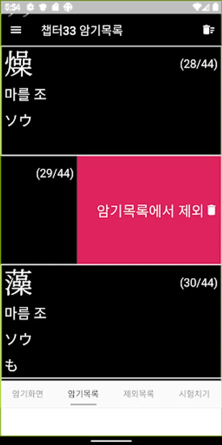 Swiping an item in the list to the left removes it from the list, and the memorize screen displays the Chinese characters in the memorize list.