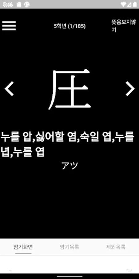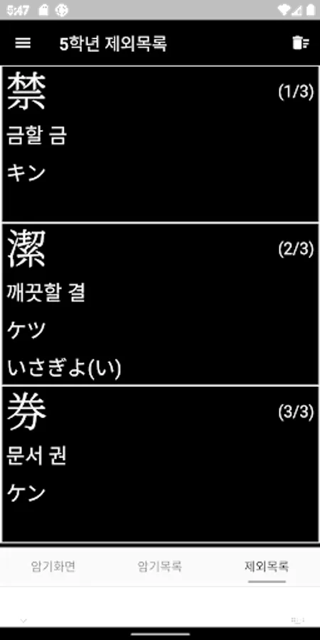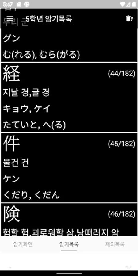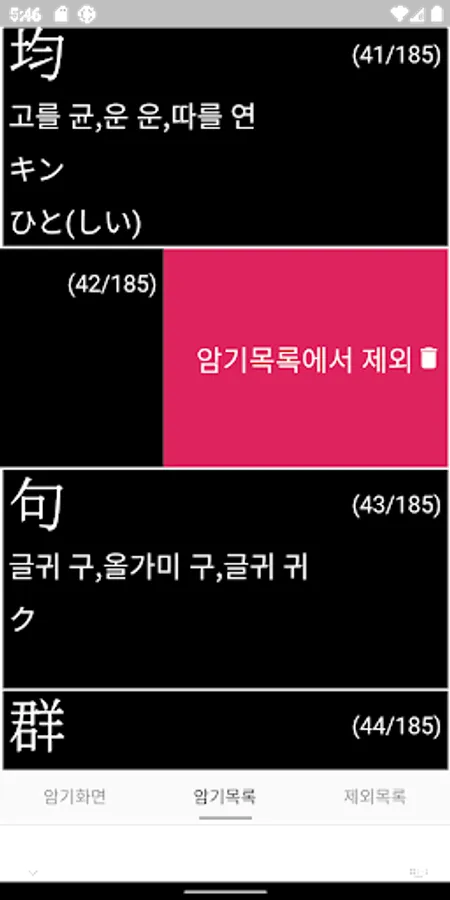 Excluded Chinese characters are displayed in the Exclusion List on the right tab, and if you slide an item from the list to the left, the relevant Chinese characters are excluded from the Exclusion List and included in the memorization list.