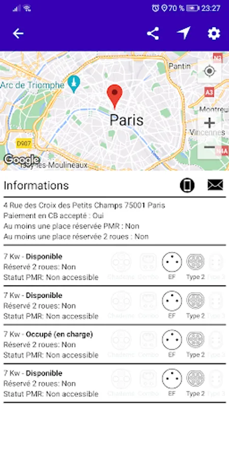 * Charging stations for electric vehicles (car and motorbike, plug type, power, availability)