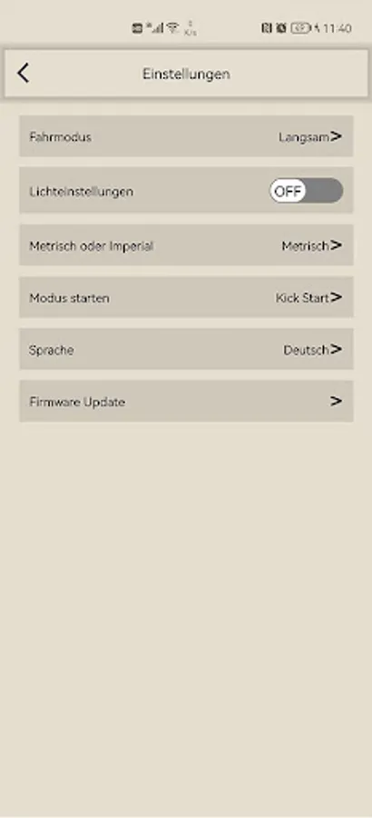 Here you will find all driving information such as battery status in percent, current speed in km / h, voltage of the battery, current amperage, current motor power in watts, controller temperature, distance traveled in km, total distance traveled in km, as well as the current firmware Version.