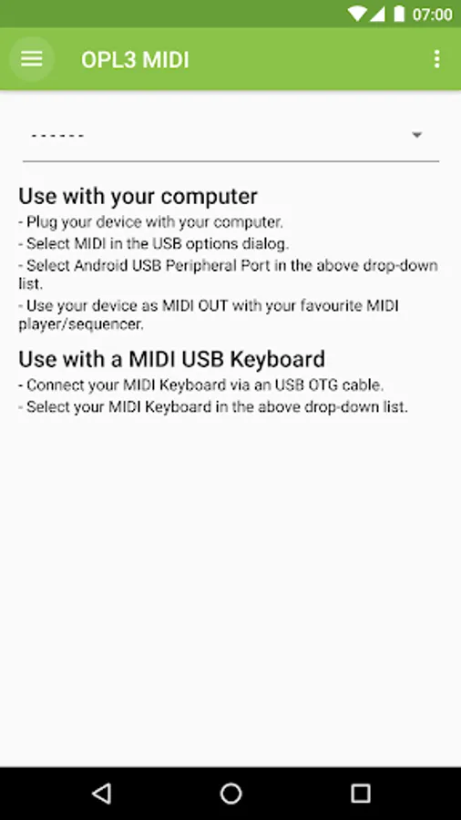Plug your device to your computer, or hook a MIDI USB master keyboard via an OTG cable to play with this low-latency OPL3 FM Synthesizer.