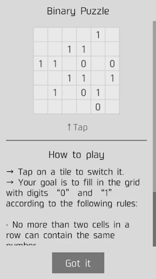 Binary Puzzle is a puzzle game that tests your logic reasoning.