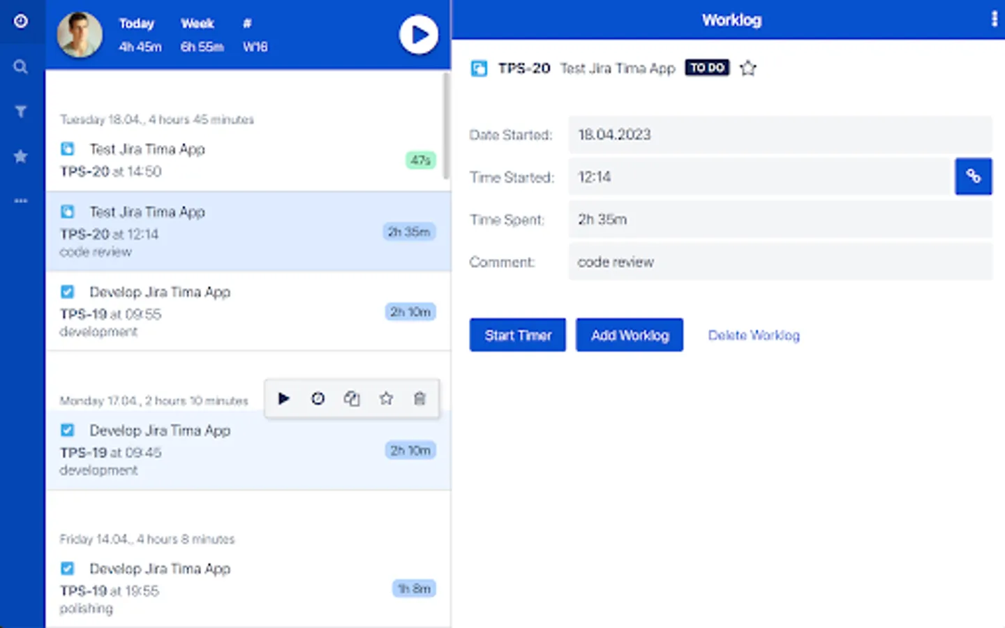 * Start a new timer or add a new worklog from last worklogs and issue search