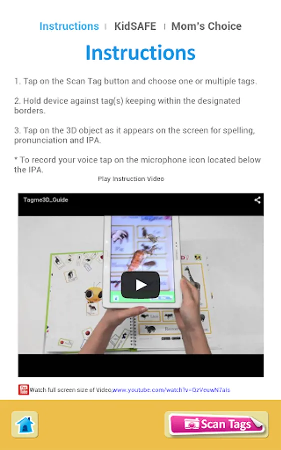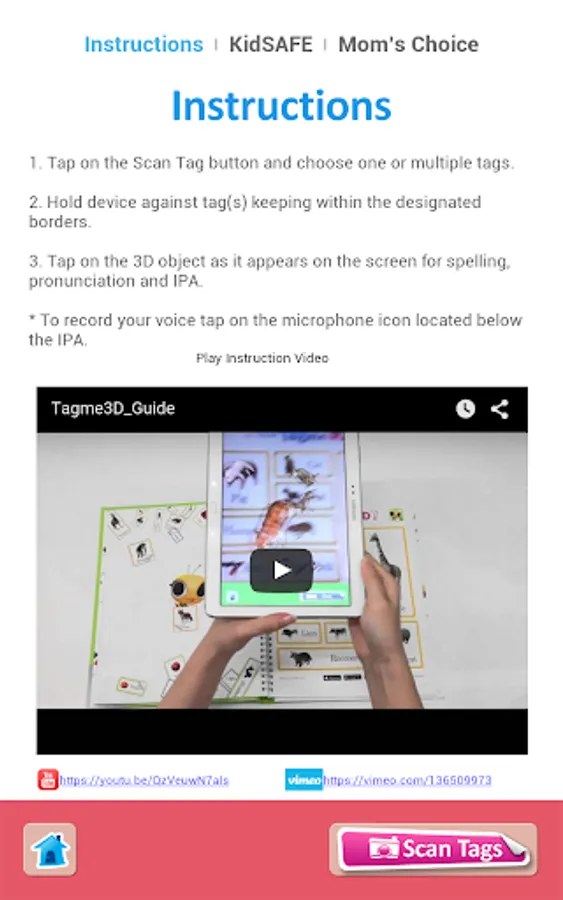 "Tagme3D" is an innovative educational app that makes learning English both simple and exciting. This application uses emergent 3D and Augmented Reality technology to combine spelling, phonics, and visual representations to help build your vocabulary. Children can have fun playing with 3D objects while learning English spelling and pronunciation. Use the app to scan the tags on each page and watch as 3Dobjects pop out of the book and into the screen of your mobile device.
