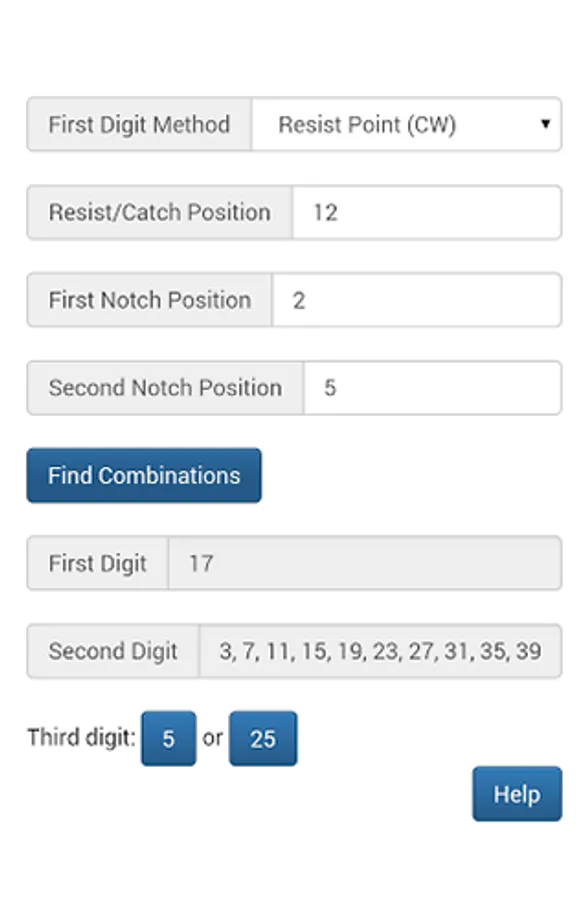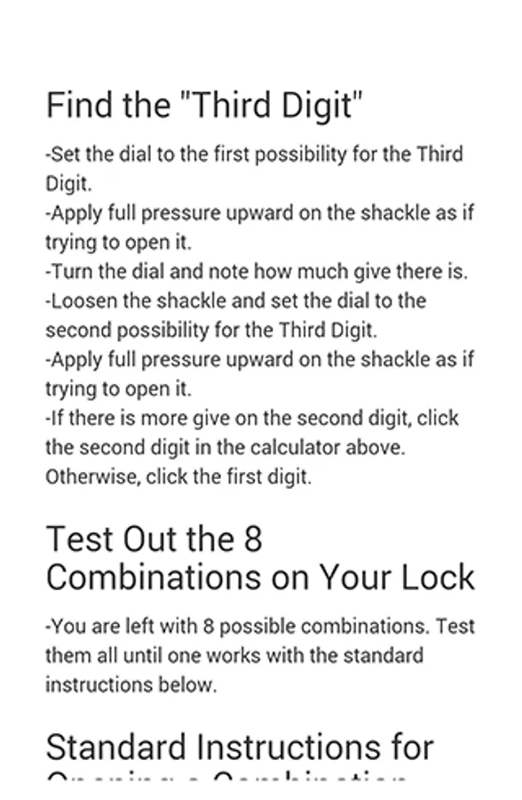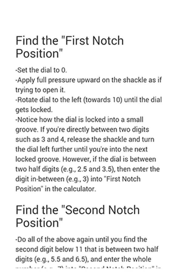 -Notice how the dial is locked into a small groove. If you're directly between two digits such as 3 and 4, release the shackle and turn the dial left further until you're into the next locked groove. However, if the dial is between two half digits (e.g., 2.5 and 3.5), then enter the digit in-between (e.g., 3) into "First Notch Position" in the calculator.