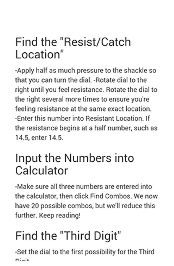 Have you forgotten the combo of your lock? This app will allow you to crack any combination lock in 8 tries or less! Using a complex algorithm this app will give you the power to open any master or combination lock. You do not need to know the combination before utilizing this app. Leave that to us!