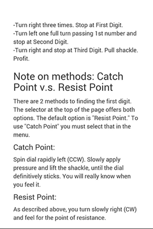 -Apply half as much pressure to the shackle so that you can turn the dial. -Rotate dial to the right until you feel resistance. Rotate the dial to the right several more times to ensure you're feeling resistance at the same exact location.