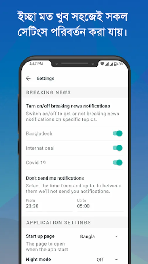 The app has some awesome features to read bangla newspapers smoothly and comortably. You can choose your color sceme that you prefer. It has two color mode day and night. Opportunity to text resizing system and zoom in - Zoom out system for your own choice. In a word the app is very smart, unique and delightful for all bangla news readers.
