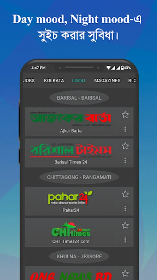 All bangla news papers app offers smooth reading experience of all trusted magazines and newspapers in bd. 700+ bangladesh news papers are availavle in this 24 news app. You can read, share, and bookmark online bangla newspapers for later reading including daily prothom alo, daily star, the independent, aajkal, daily ittefaq, daily kaler kantho, daily bangladesh pratidin, amardesh online, anandabazar patrika etc.