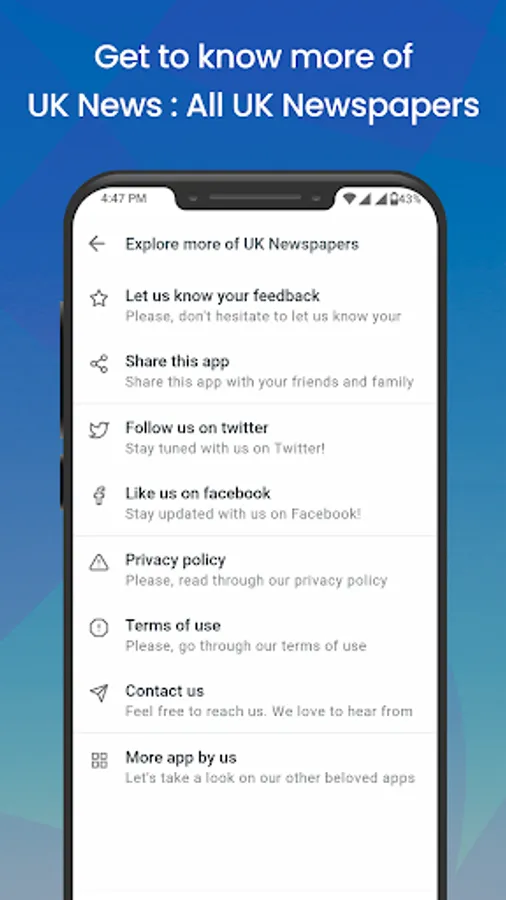 These important and the useful features make the UK Newspaper app a rich, elegant, and unique newspapers app on the Google Play Store. As we think it'll be much more helpful for newspaper readers to read, bookmark, and share the news with others. Because the news app contains most of the UK magazines and newspapers. That's why the number of newspapers is increasing gradually. You also can send your own newspaper link to add to it or any other recommendation. Our support team will be prompt to make a quick response to you.