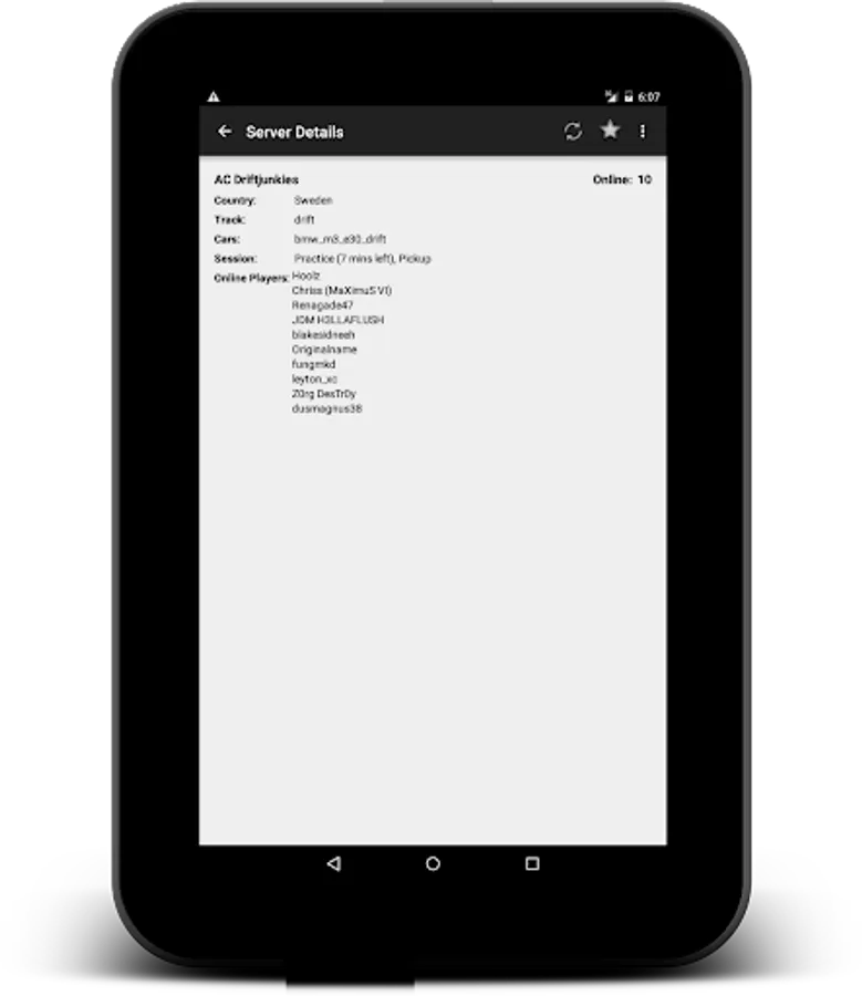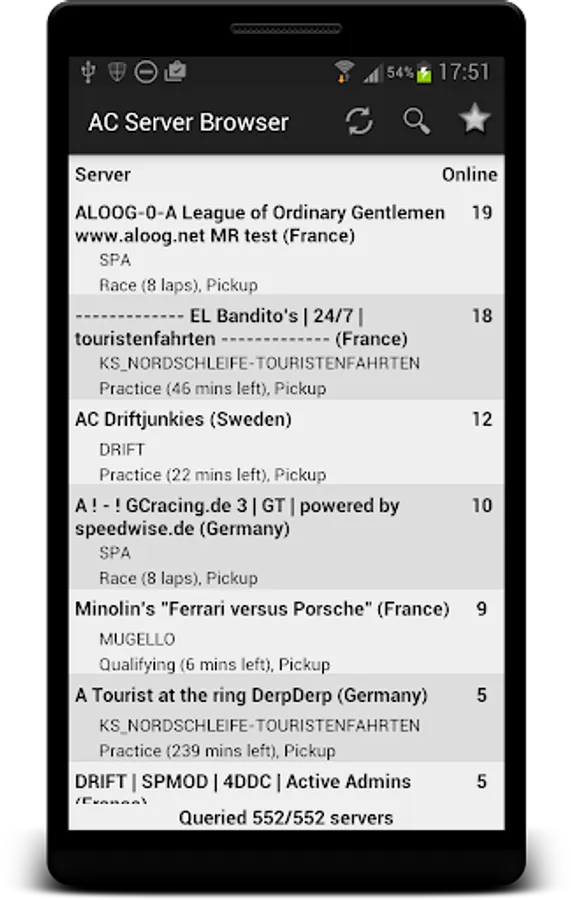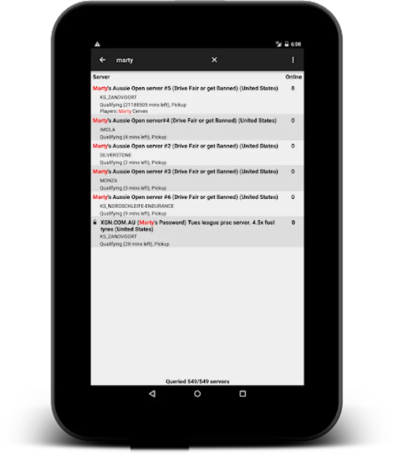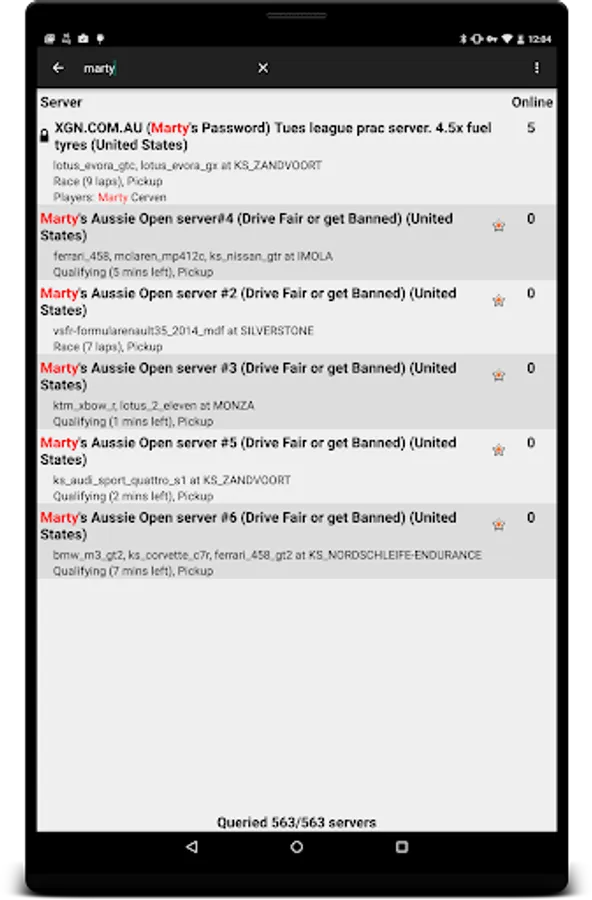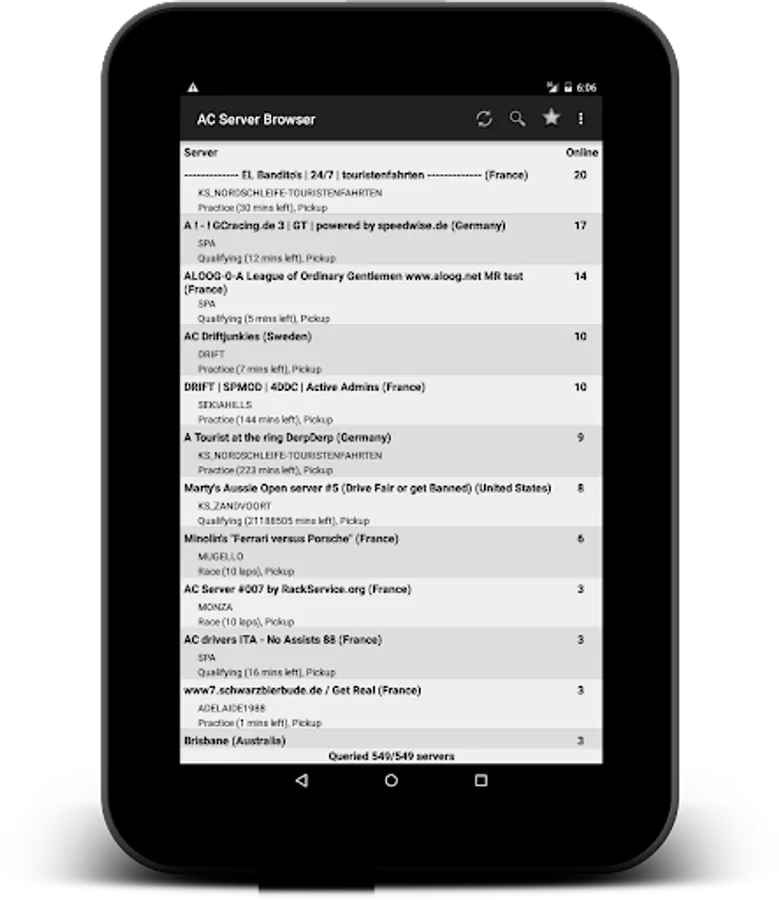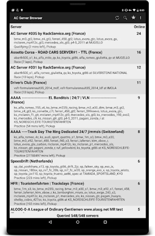 The Assetto Corsa Server Browser lets you check Assetto Corsa racing sim multiplayer servers to see which servers currently have players in them and who's online right now, from the convenience of your Android device, without having to turn on your gaming machine. If you find players available for a quick race using the Assetto Corsa Server Browser, then you know it's worth turning on your gaming machine and running Assetto Corsa to join a race.