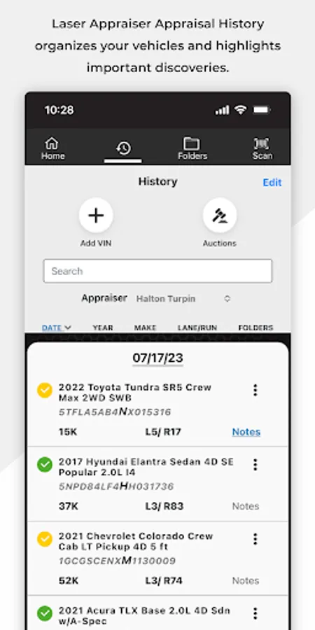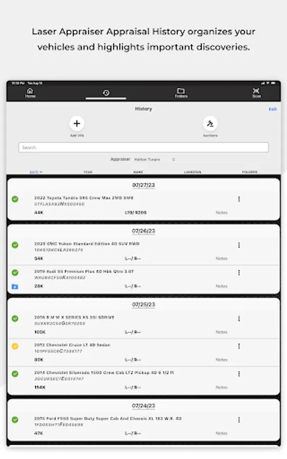 Laser Appraiser is the original car dealership vehicle appraisal and automotive valuation tool designed specifically to increase dealer used car profit margins. It uses a variety of data points to provide dealerships with the most accurate and up-to-date appraisals possible, supplying dealer lots with wholesaling solutions at minimum costs, while also identifying insights into the hottest used car market buying trends, informing our clients where the biggest demand is and will be. VIN Scanner is easy to use, fast, and flexible, making it a great solution for dealerships of all sizes looking to increase return on investment (ROI).