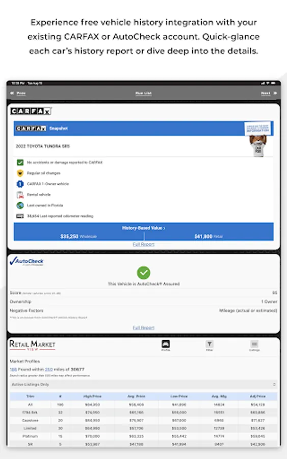 Vehicle History Reports – Glimpse CARFAX™ and Experian Autocheck results with “at a glance” vehicle history checkmarks, or detailed reporting drill down;