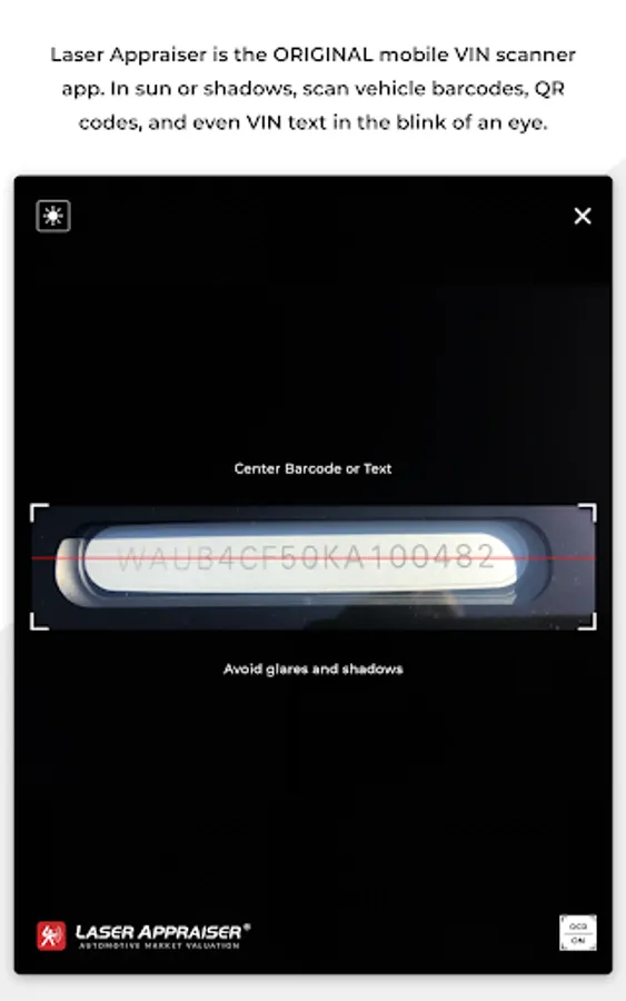 VIN Scanner is designed for car professionals to remotely access the Laser Appraiser vehicle valuation solution. Instantly access industry guidebooks like J.D. Power (NADA), Black Book, Manheim Market Report, Kelley Blue Book, Galves, and more. Integrate Vehicle History Reports Carfax and Experian AutoCheck for FREE. In the lanes or on your lot, VIN Scanner delivers fast and accurate VIN barcode and VIN text scanning, manual VIN entry, and car drill-down using Year, Make, Model specs.