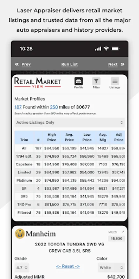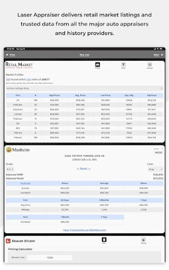 Retail Sales Data – Discover live sales data and Market Days’ Supply (MDS) for the vehicle you’re researching using proprietary Laser Appraiser data;