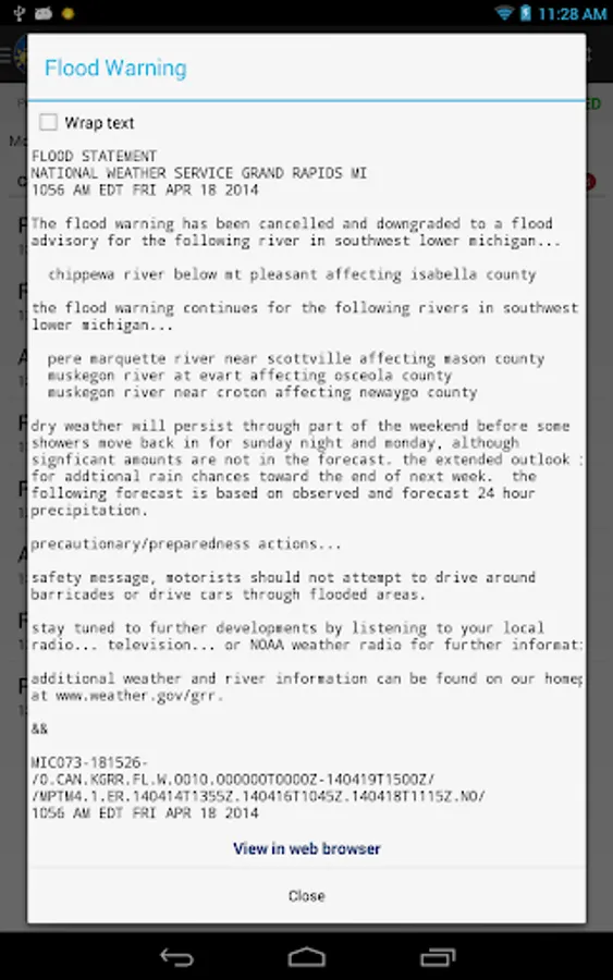 Real-time push weather alerts can be set for any location across the USA, including all 50 states and Puerto Rico. Our advanced weather alerting system has been in operation for 8 years and provides critical weather alerts to businesses and individuals across the country. Our system allows you to select only the alerts you wish to receive. Select only tornado warnings, or select custom sets of alerts including severe thunderstorm watches, flood warnings, and tropical alerts. Then, select alerts for your GPS location or for a home or office. Advanced users will enjoy access to Area Forecast Discussions, Mesoscale Discussions, and Severe Weather Outlooks pushed right to your device. Our push service is faster and avoids the battery drain of other alerting apps that "poll" for alerts.