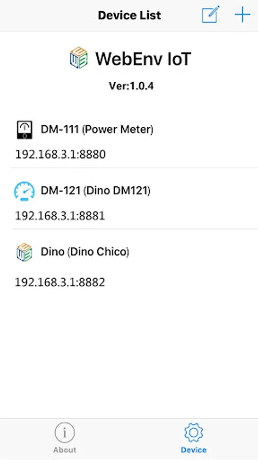 WebEnv IoT is a lite monitoring platform to provide connectivity with IoT devices of WebEnv such as DM-111, DM-121, DM-131, 1CHKWH, C21-KWH8CT, C27-8CT8DO, C40-1CH8DO and WebEnv WSN. Parameter read from each device can be displayed in WebEnv IoT.