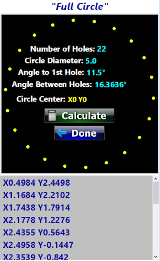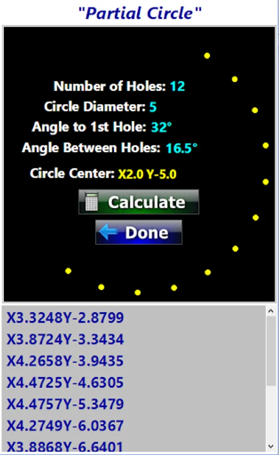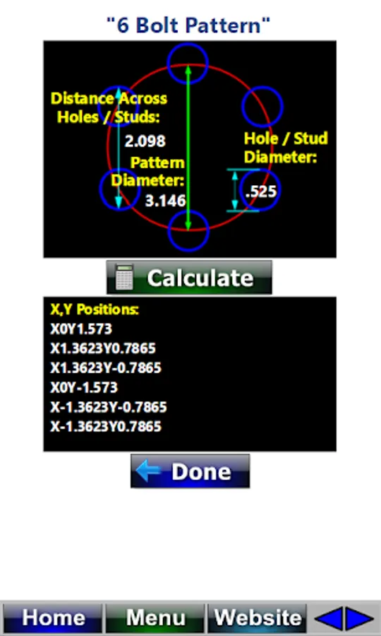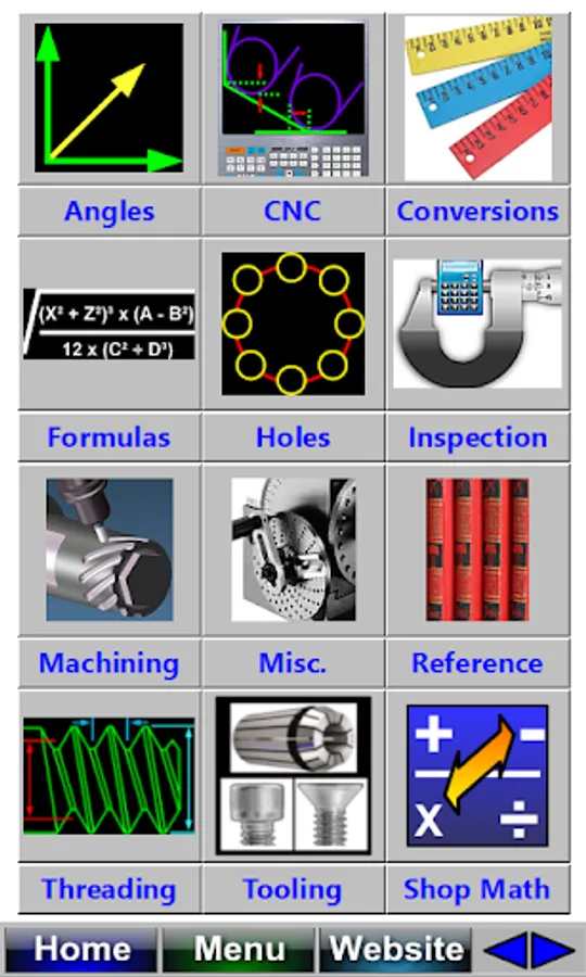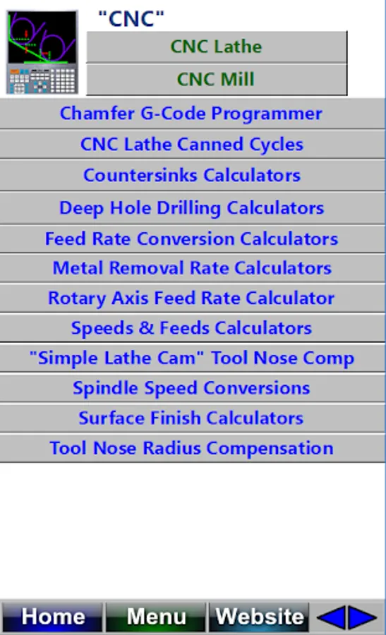 Web Machinist has many calculators for CNC Machinists, Programmers and QC Inspectors. Bolt Circle Calculator, Wheel Bolt Pattern Calculators, Including Calculators for Angles, CNC Applications, CNC Lathe Fanuc Canned Cycles including G76 Thread Cycle Calculators, Simple Lathe Cam CNC Lathe Tool Nose Compensation G-Code Calculators, Chamfer G-Code Calculators, Metric Conversions, Countersink Depth Calculators, Center Drill Depth Calculators, General Conversions, CNC Drilling, CNC Mill & Lathe Deep Hole Drilling calculators, Dovetail Measuring Calculators, Blueprint Symbols, G Codes, M Codes, Machining Formulas and calculators, Spindle speed and feed rate formulas and calculators, circle solving formulas, Hole Patterns, Hole Array Patters including full circle and partial circle patterns, 3 Wire Threads Pitch Diameter Measuring Calculators for Unified Threads, Metric Threads, Acme Threads and Metric Trapezoidal Threads, CNC Lathe Tool Nose Radius compensation calculators, QC Inspection, Manual Machining, Metal Removal Rates, CNC Milling, Reference, Rotary Axis, Speeds & Feeds, Imperial and Module Spur Gear Dimensions Calculators, CNC Tapping, CNC Threading, Manual Lathe Calculators, Unified Threads, Metric Threads, Acme Threads, Metric Trapezoidal Threads, Spur Gears, Module Spur Gears, Imperial Spur Gears, Area Calculators, Triangles, Circle Calculators, Mill Machine Tooling, Collets dimensions, Keyseat Cutters Calculators, Trigonometry Calculators, Hole Pattern Calculators, Wheel Bolt Pattern Calculators, Manual Mill Calculators, Tooling & Hardware, Sine Bar and Compound Sine Plate calculators, Trigonometry & Geometry, Shop Math Calculators, Lathe Spindle Speed Calculators, CNC Tapping Speeds Calculators, Surface Roughness Calculators, Drilling Speeds Calculators, Tapping Speeds Calculators, CNC Turning and Miscellaneous Calculators. This is a Must Have Program for Machinists, CNC Machinists, Machine Shops, QC Inspectors, CNC Set-up Operators, CNC Programmers.