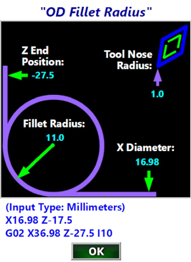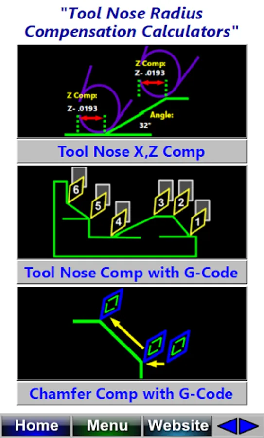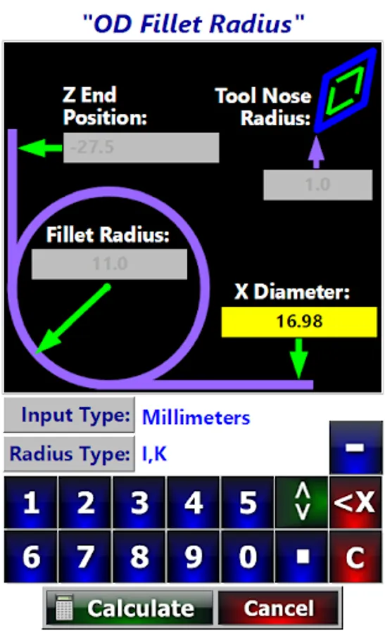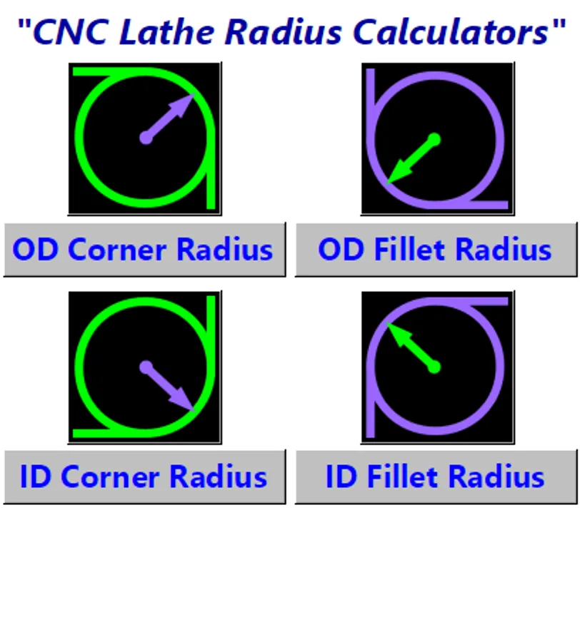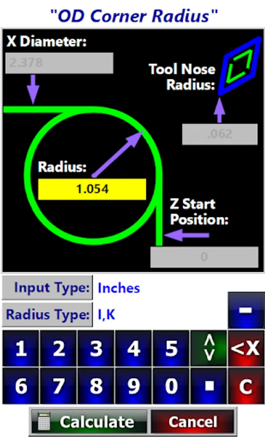 Quickly and easily calculate the G Code needed to program corner radius and fillet radius on a cnc lathe. Both OD and ID radius are supported. This also includes Web Machinist mobile Pro. Web Machinist Mobile Pro App has many cnc programming calculators for CNC Machinists, Programmers and QC Inspectors. CNC Lathe Radius Calculators, Bolt Circle Calculator, Wheel Bolt Pattern Calculators, Including Calculators for Angles, G code lists, M code lists, Circle Calculators including Circle Segment Calculator, Circle Section Calculator, Basic Circle Calculators, Right Triangle Calculator, Oblique Triangle Calculator, Angle Conversion Calculator, Machinist Triangle Calculators, CNC Applications, Metal Weight Calculators for both Metric and Imperial calculations, CNC Lathe Fanuc Canned Cycles including G76 Thread Cycle Calculators, Simple Lathe Cam CNC Lathe Tool Nose Compensation G-Code Calculators, tapping solutions app, metal weight calculator, Chamfer G-Code Calculators, Tap Drill Charts and Tapping Calculators, Metric Conversions, Countersink Depth Calculators, Center Drill Depth Calculators, General Conversions, CNC Drilling, CNC Mill & Lathe Deep Hole Drilling calculators, Dovetail Measuring Calculators, Blueprint Symbols, G Codes, M Codes, Machining Formulas and calculators, Spindle speed and feed rate formulas and calculators, circle solving formulas, Hole Patterns, Hole Array Patters including full circle and partial circle patterns, 3 Wire Threads Pitch Diameter Measuring Calculators for Unified Threads, Metric Threads, Acme Threads and Metric Trapezoidal Threads, CNC Lathe Tool Nose Radius compensation calculators, QC Inspection, Manual Machining, Metal Removal Rates, CNC Milling, Reference, Rotary Axis, Speeds & Feeds, Imperial and Module Spur Gear Dimensions Calculators, CNC Tapping, CNC Threading, Manual Lathe Calculators, Unified Threads, Metric Threads, Acme Threads, Metric Trapezoidal Threads, Spur Gears, Module Spur Gears, Imperial Spur Gears, Area Calculators, Triangles, Circle Calculators, Mill Machine Tooling, Collets dimensions, Keyseat Cutters Calculators, Trigonometry Calculators, Hole Pattern Calculators, Wheel Bolt Pattern Calculators, Manual Mill Calculators, Tooling & Hardware, Sine Bar and Compound Sine Plate calculators, Trigonometry & Geometry, circle calculator, Shop Math Calculators, Lathe Spindle Speed Calculators, CNC Tapping Speeds Calculators, Surface Roughness Calculators, Drilling Speeds Calculators, Tapping Speeds Calculators, CNC Turning and Miscellaneous Calculators. Circle Pocket Milling Calculator. This is a Must Have Program for Machinists, CNC Machinists, Machine Shops, QC Inspectors, CNC Set-up Operators, CNC Programmers.