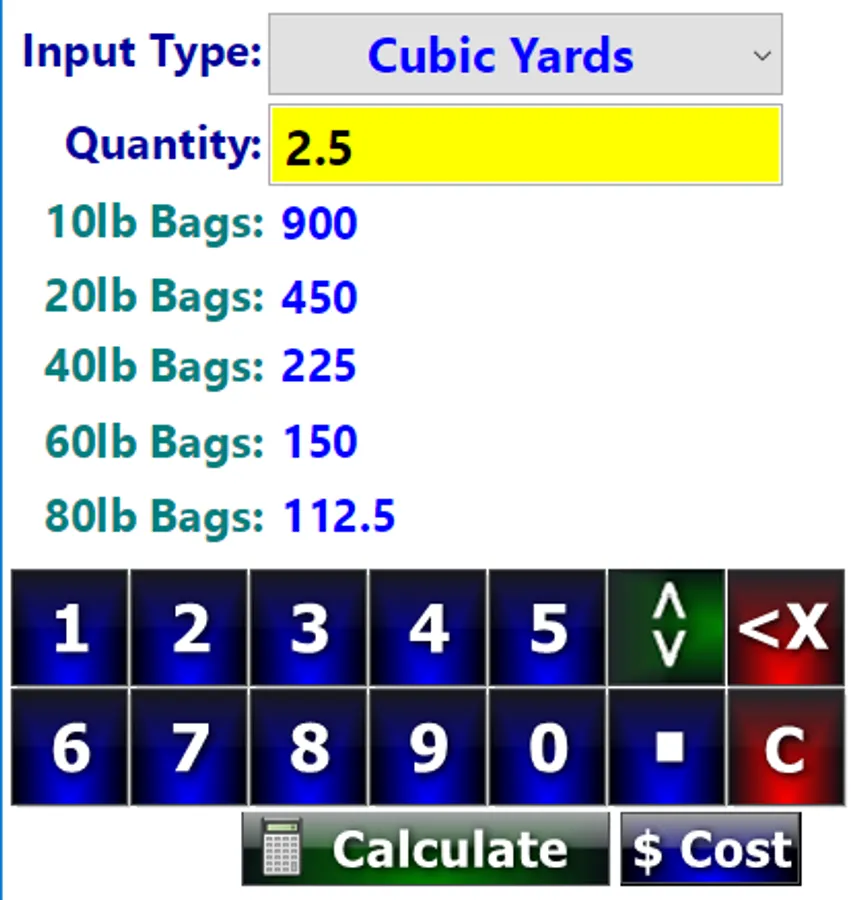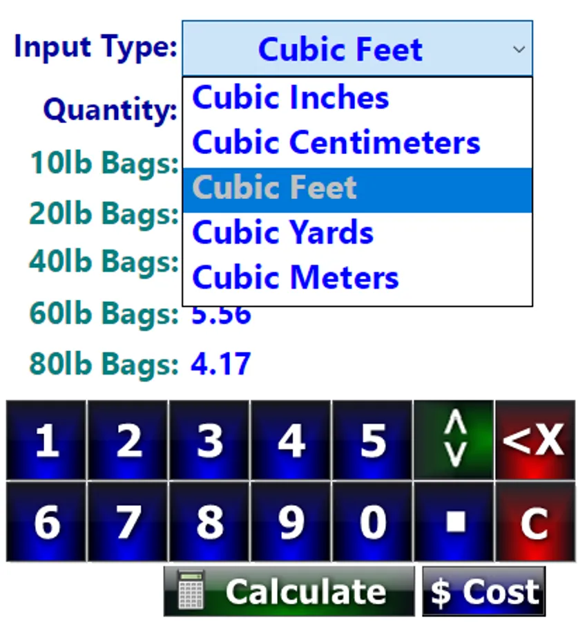 Quickly and easily calculate the number of concrete or cement bags needed to do a concrete or cement job. Especially useful for pre-mix and ready mix bags calculations. You can calculate the number of 10lb, 20lb, 40lb, 60lb and 80lb concrete or cement bags needed. You can input the concrete or cement quantity in cubic inches, cubic centimeters, cubic feet, cubic yards or cubic meters. You can also calculate the cost for the number of concrete or cement bags needed too.