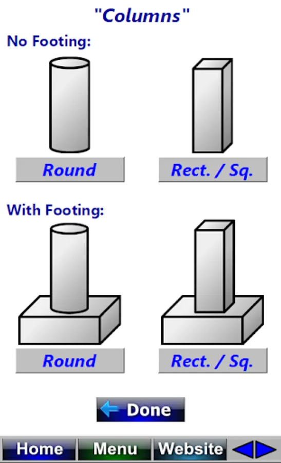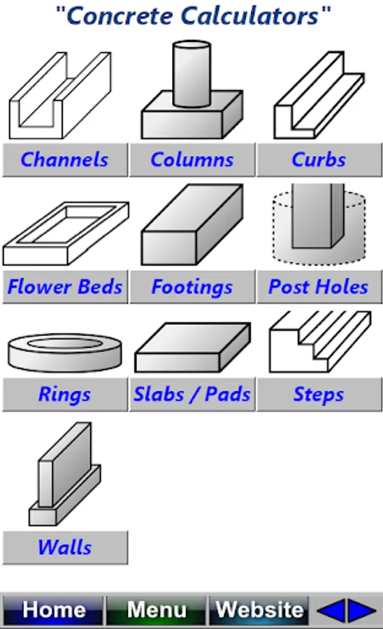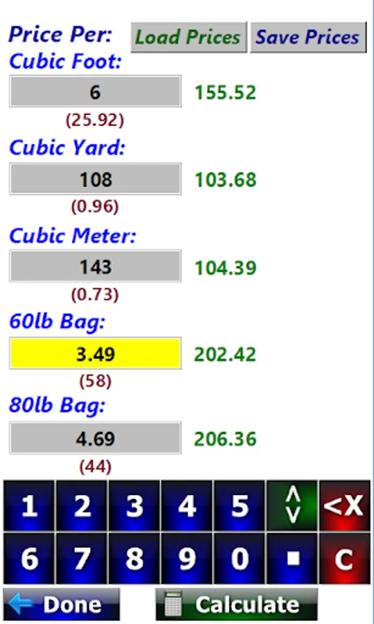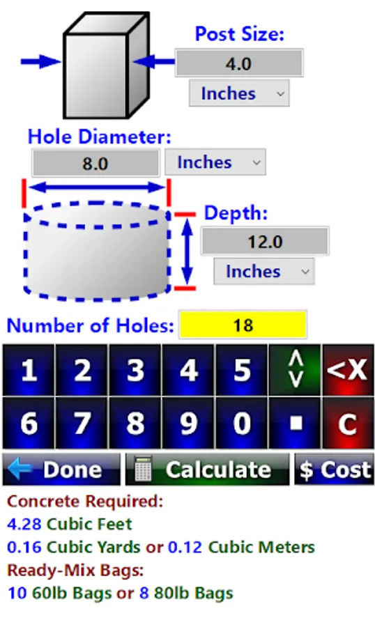 Quickly and Easily Calculate the Concrete Needed for Pouring Slabs, Columns, Footings, Steps, Flower Beds, Rings, Post Holes, curbs & Gutters. Include are a lot of calculators including concrete calculator, cubic meter calculator, cubic foot calculator, cubic yard calculator, quikrete calculator, ready mix calculator, pre-mix calculator, cement calculator, concrete cost calculator, concrete columns calculator, concrete steps calculator, concrete wall calculator, concrete footings calculator, post holes calculator, concrete slabs calculator, concrete pad calculator, concrete curb calculator, concrete gutter calculator, concrete flower beds calculator, concrete rings calculator, cement cost calculator, cement columns calculator, cement steps calculator, cement wall calculator, cement footings calculator, cement concrete post holes calculator, cement slabs calculator, cement pad calculator, cement curb calculator, cement gutter calculator, cement flower beds calculator, cement rings calculator, cement bags calculator, concrete bags calculator, concrete estimator calculator, cement estimate calculator, concrete volume calculator, cement volume calculator, ready mix concrete bags calculator, ready mix cement bags calculator. This Calculator calculates the amount of concrete or cement needed in Cubic Feet, Cubic Yards, Cubic Meters and also calculates the number of 60 or 80 pound bags of Ready-Mix needed if desired. Also the concrete calculator calculates the concrete or cement cost too! You can also save the concrete prices for easy future concrete cost calculations. This is a great app for contractors, carpenters, construction pros and Do it Your Selfers!