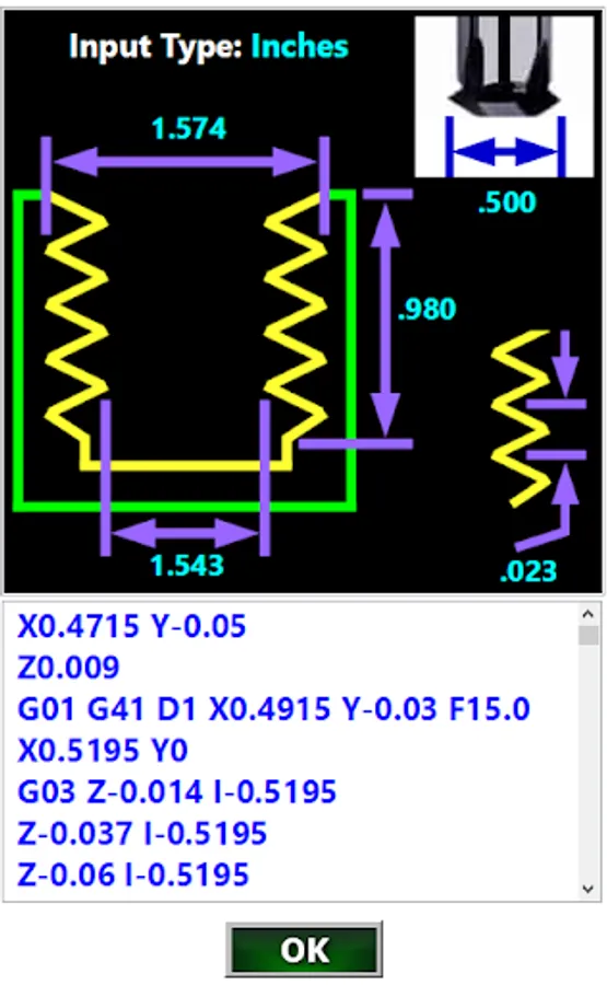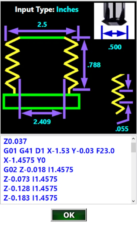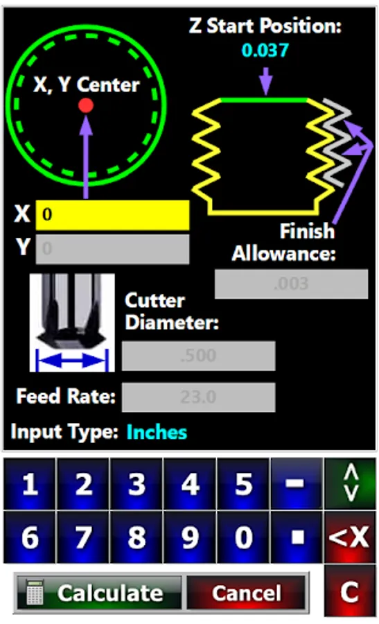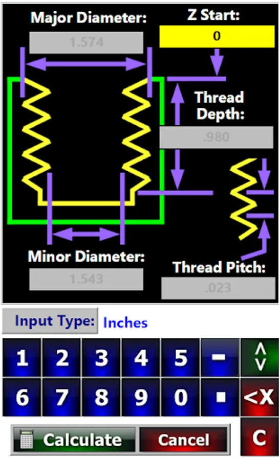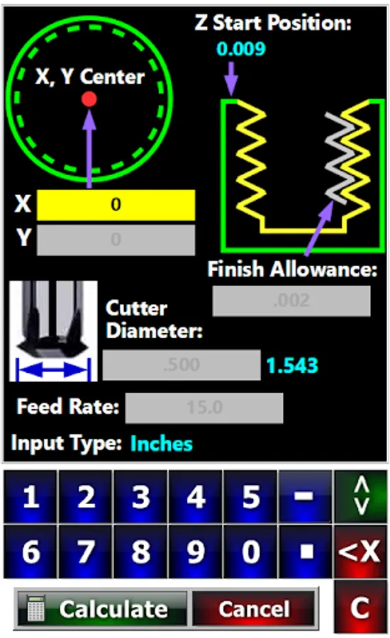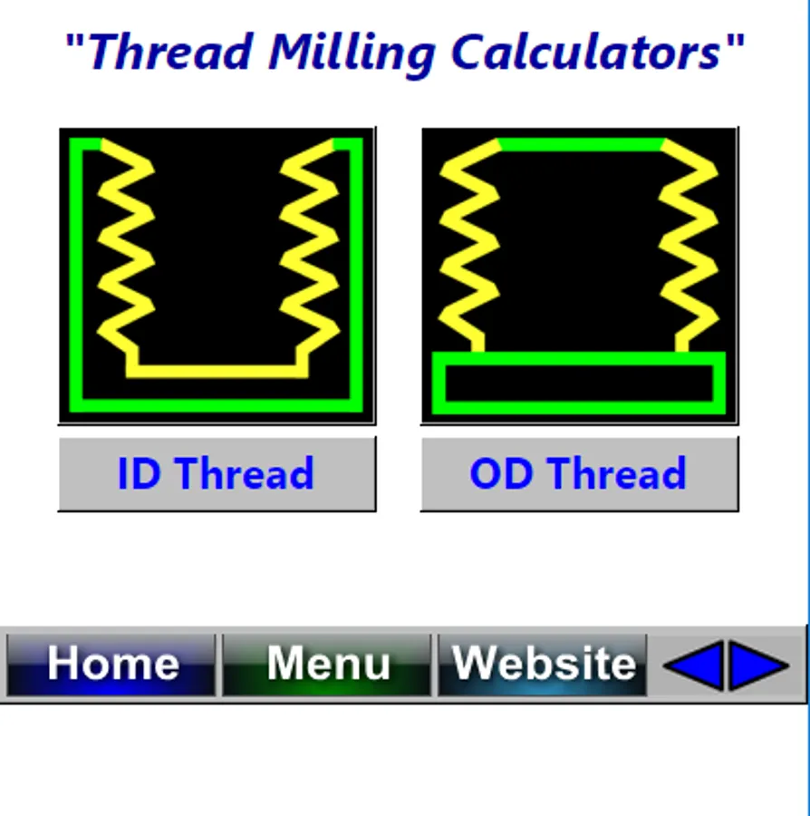 Quickly and easily make a cnc G Code program to mill ID and OD threads on a cnc mill. This is part of the Web Machinist Mobile Pro App: Web Machinist Mobile Pro App has many cnc programming calculators for CNC Machinists, Programmers and QC Inspectors. Thread Milling Calculator, CNC Lathe Radius Calculators, Bolt Circle Calculator, Wheel Bolt Pattern Calculators, Including Calculators for Angles, G code lists, M code lists, Circle Calculators including Circle Segment Calculator, Circle Section Calculator, Basic Circle Calculators, Right Triangle Calculator, Oblique Triangle Calculator, Angle Conversion Calculator, Machinist Triangle Calculators, CNC Applications, Metal Weight Calculators for both Metric and Imperial calculations, CNC Lathe Fanuc Canned Cycles including G76 Thread Cycle Calculators, Simple Lathe Cam CNC Lathe Tool Nose Compensation G-Code Calculators, tapping solutions app, metal weight calculator, Chamfer G-Code Calculators, Tap Drill Charts and Tapping Calculators, Metric Conversions, Countersink Depth Calculators, Center Drill Depth Calculators, General Conversions, CNC Drilling, CNC Mill & Lathe Deep Hole Drilling calculators, Dovetail Measuring Calculators, Blueprint Symbols, G Codes, M Codes, Machining Formulas and calculators, Spindle speed and feed rate formulas and calculators, circle solving formulas, Hole Patterns, Hole Array Patters including full circle and partial circle patterns, 3 Wire Threads Pitch Diameter Measuring Calculators for Unified Threads, Metric Threads, Acme Threads and Metric Trapezoidal Threads, CNC Lathe Tool Nose Radius compensation calculators, QC Inspection, Manual Machining, Metal Removal Rates, CNC Milling, Reference, Rotary Axis, Speeds & Feeds, Imperial and Module Spur Gear Dimensions Calculators, CNC Tapping, CNC Threading, Manual Lathe Calculators, Unified Threads, Metric Threads, Acme Threads, Metric Trapezoidal Threads, Spur Gears, Module Spur Gears, Imperial Spur Gears, Area Calculators, Triangles, Circle Calculators, Mill Machine Tooling, Collets dimensions, Keyseat Cutters Calculators, Trigonometry Calculators, Hole Pattern Calculators, Wheel Bolt Pattern Calculators, Manual Mill Calculators, Tooling & Hardware, Sine Bar and Compound Sine Plate calculators, Trigonometry & Geometry, circle calculator, Shop Math Calculators, Lathe Spindle Speed Calculators, CNC Tapping Speeds Calculators, Surface Roughness Calculators, Drilling Speeds Calculators, Tapping Speeds Calculators, CNC Turning and Miscellaneous Calculators. Circle Pocket Milling Calculator. This is a Must Have Program for Machinists, CNC Machinists, Machine Shops, QC Inspectors, CNC Set-up Operators, CNC Programmers.