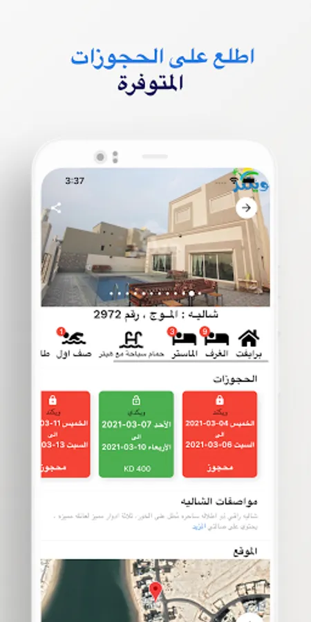 تطبيق ويكند الدليل الأول للشاليهات والمزارع و الاستراحات يتيح للعملاء الاطلاع على الايام المتاحه للحجز موضحه بالبيانات و الصور والموقع الخاص بالشاليه أو الاستراحة .