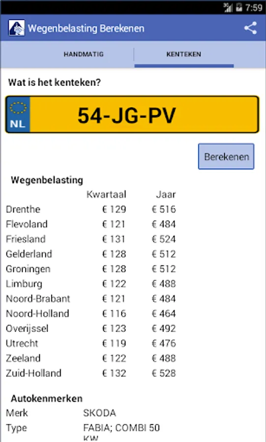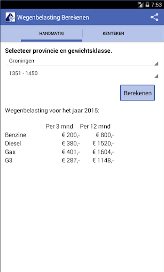 Calculate the current road tax for a car based on the province and the weight of the car.