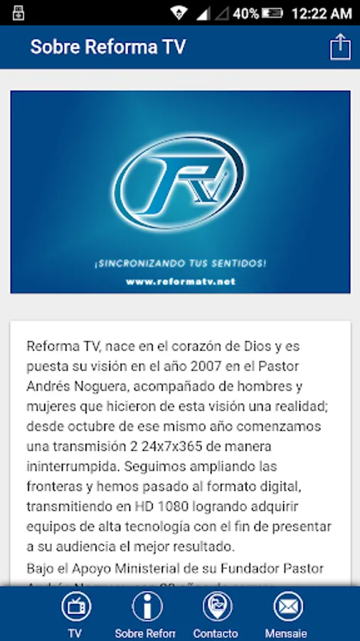 Reform TV, born in the heart of God and is putting his vision in 2007 in Pastor Andres Noguera, accompanied by men and women who made this vision a reality; since October of that year began a transfer 2 24x7x365 without interruption. We continue to push the boundaries and we have moved to digital, HD broadcast in 1080 achieving acquire high-tech equipment in order to present your audience the best result.