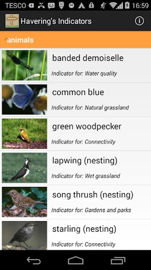 Provides a list and detailed descriptions of Havering's indicator species – easily identifiable plants and animals representing the full range of habitats in the borough. When you identify one, the app makes it easy to send the necessary details to GIGL, London's recording centre. This information will help us to track how well the species is doing and decide what action is needed to look after it and the habitats that it relies on.