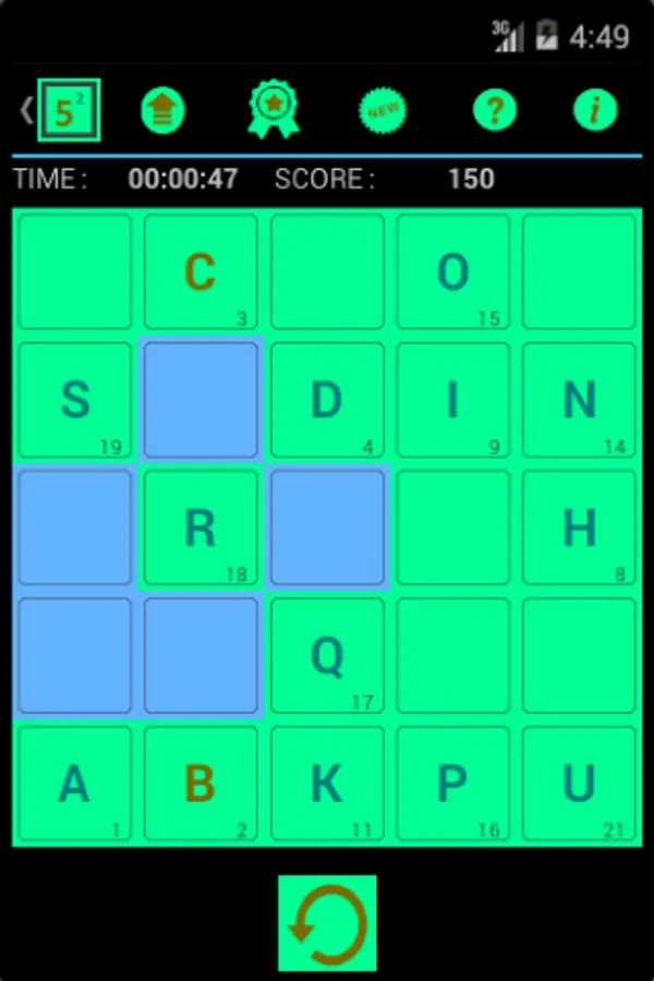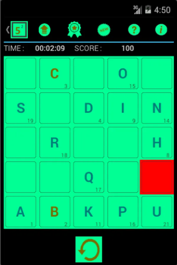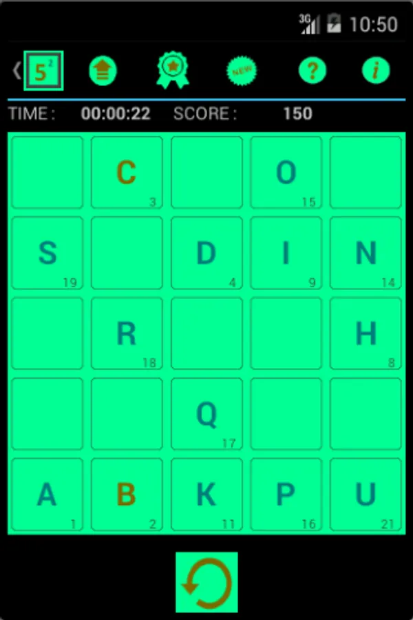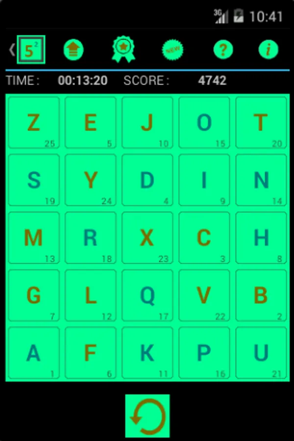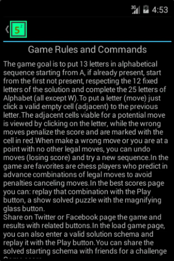 The game goal is to complete the 25 letters of the alphabet (all except W) sequentially starting from A and respecting the 12 letters of the solution set, if A is already present, start from B, even if the B already exist start from C and so on to the next letters.To put a letter (move) just click an empty cell valid and linked to the previous letter already existing.The cells viable for a potential move from a letter are viewed by clicking on the letter, for example, the valid positions to put B are displayed by clicking on A (substantially are the adjacent cells that surround the cell dand in the cases it has on the edges are also considered the cells from the opposite side), while the wrong moves penalize the score and are highlighted with red in the cell.When make a wrong move or you are at a point with no other legal moves, you can undo moves (losing score) and try a new sequence.In the game are favorites are chess players who predict in advance combinations of legal moves to avoid penalties canceling moves.In the best scores page you can: replay that combination with the Play button, a show solved puzzle with the magnifying glass button.