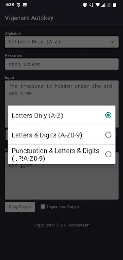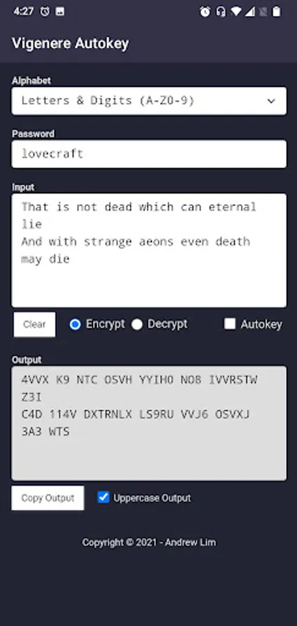 Also supports the Autokey variant, where the plaintext is appended to the key.