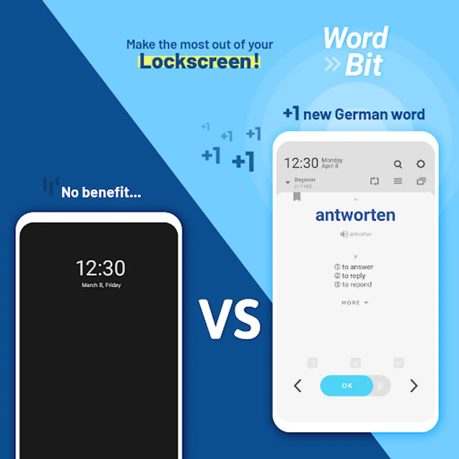WordBit provides content in a perfect size suitable for lockscreen and from now on learning will only take an instant. So there's no need to stop doing what you do!