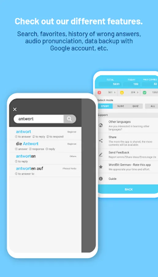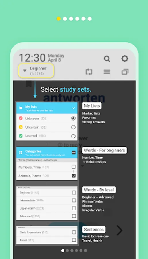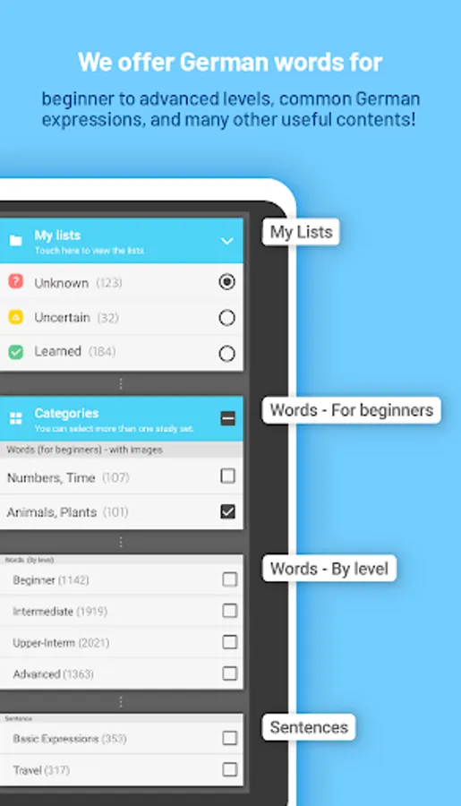 You can study words and phrases adapted to your level. (More than 10,000 words from basic to advanced)