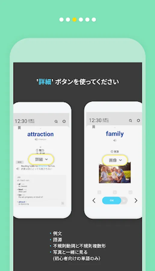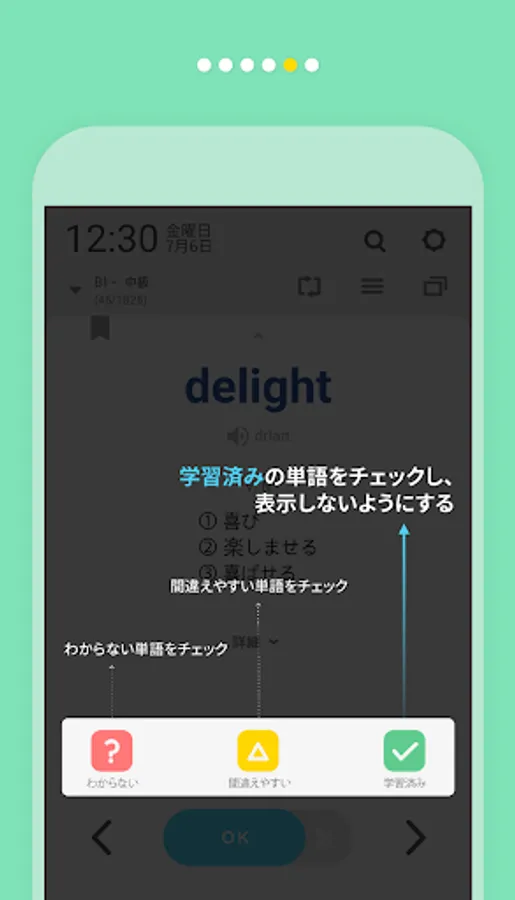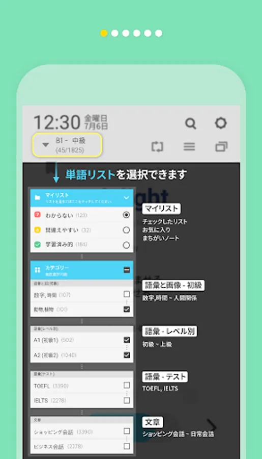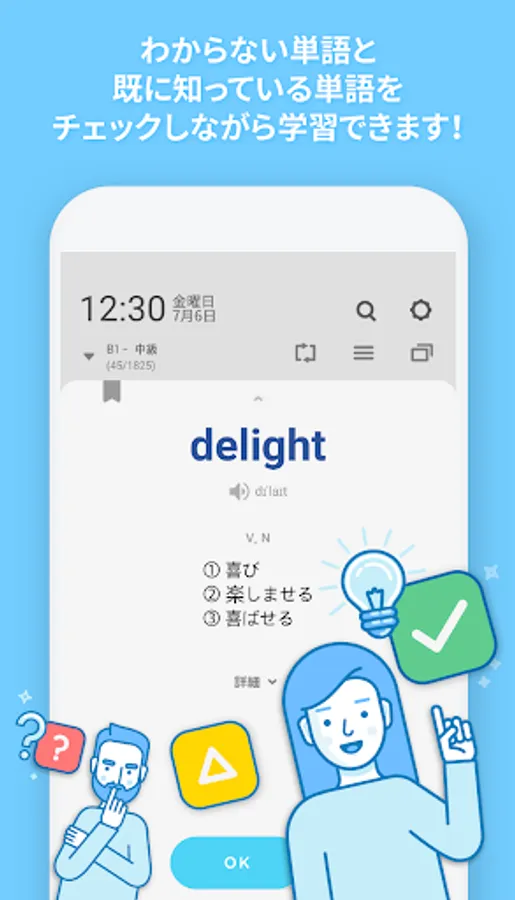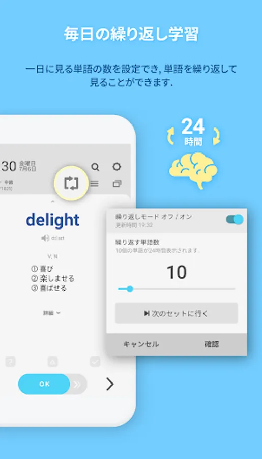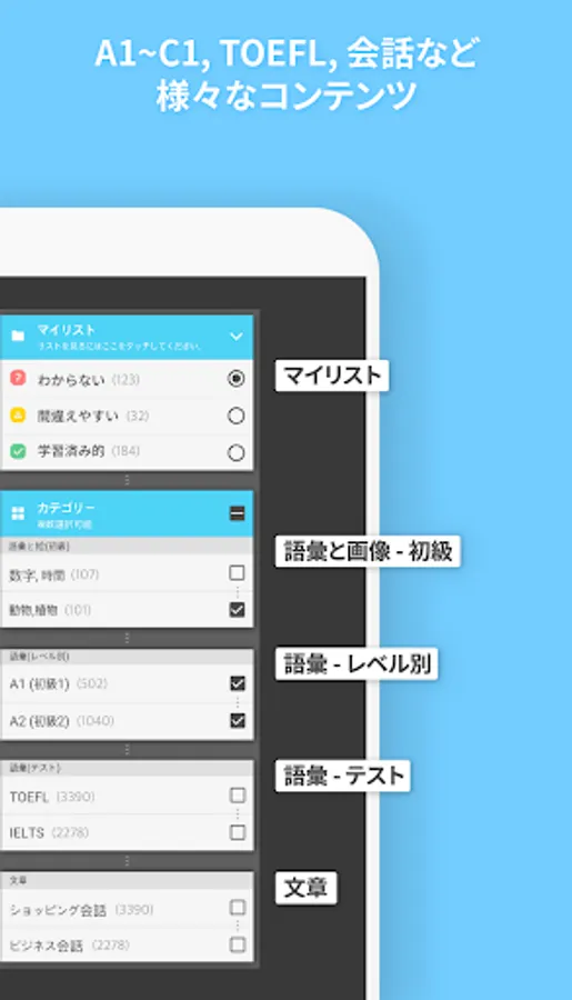 Learn words and phrases that suit your level. (Over 10,000 words from beginner to advanced)
