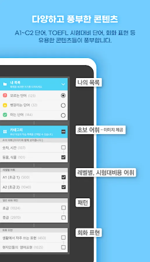 - Vocabulary for test preparation such as TOEIC, CSAT, transfer, TOEFL, civil service, and internal credit words