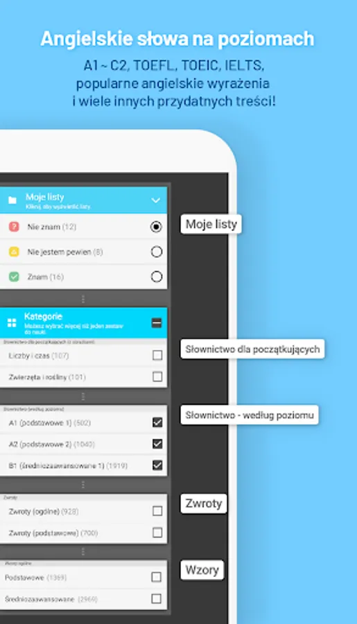 You can learn words suited to your level. (Over 10,000 words, from basic to advanced)