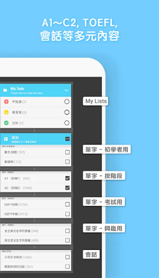 - TOEFL, IELTS, GEPT, GRE, academic test words, elementary school, junior high school, high school, "finger test" words and other test-specific vocabulary
