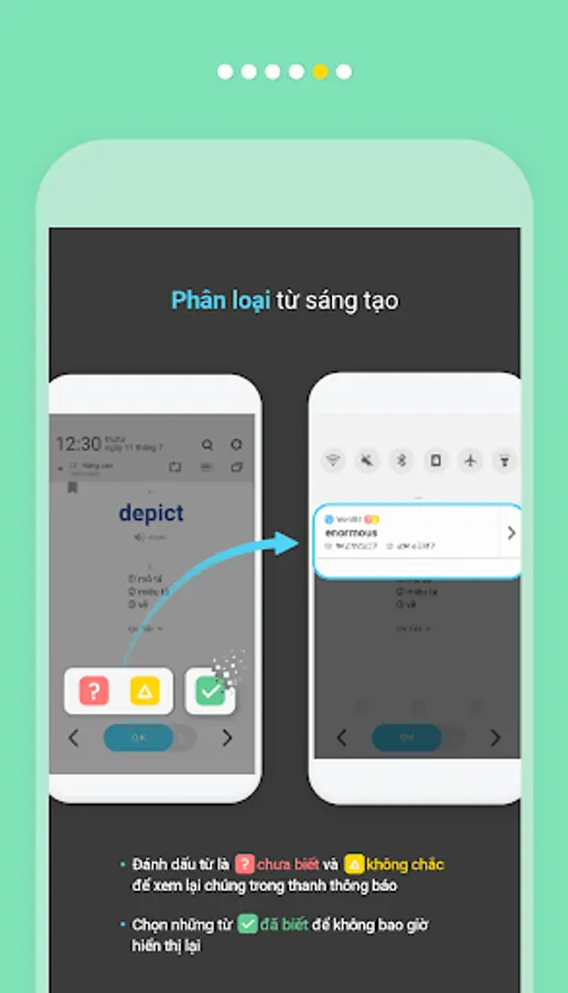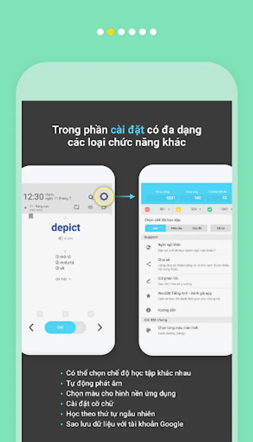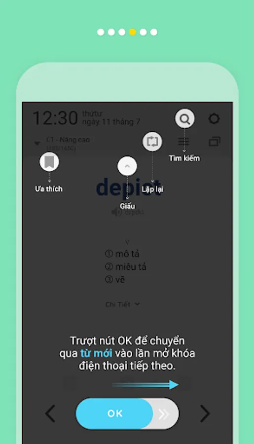 (1) After you download and start the application, the learning mode will be activated automatically. This application is designed to automatically learn English. So every time you turn on your phone, the app will be activated on the lock screen and help you learn English.