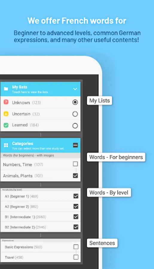 You can study words and phrases adapted to your level. (More than 10,000 words from basic to advanced)