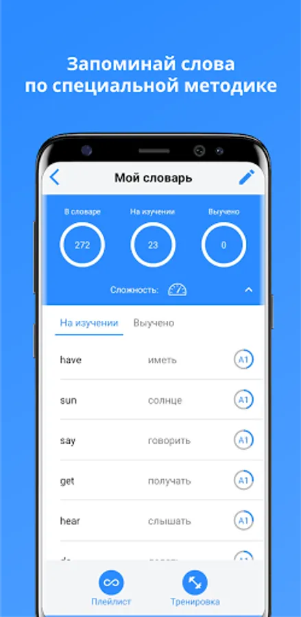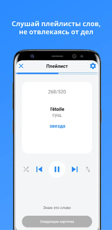 Playlists allow you to quickly view and listen to large sets of words, there is a random selection of words Shuffle, you can adjust the number of repetitions of words and translations, pauses between words, set the order of the word and its translation. This is useful for those who are not used to being distracted from household chores or who like to spend time on the road with benefit.