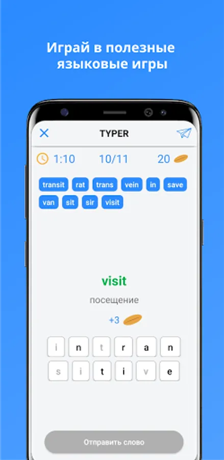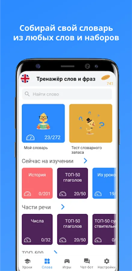 Learning words is based on an adapted technique of spaced repetition, taking into account the Ebbinghaus forgetting curve and aspects of the functioning of the human brain. This technique allows you to keep words in memory for a long time and not to forget them when they are especially needed.