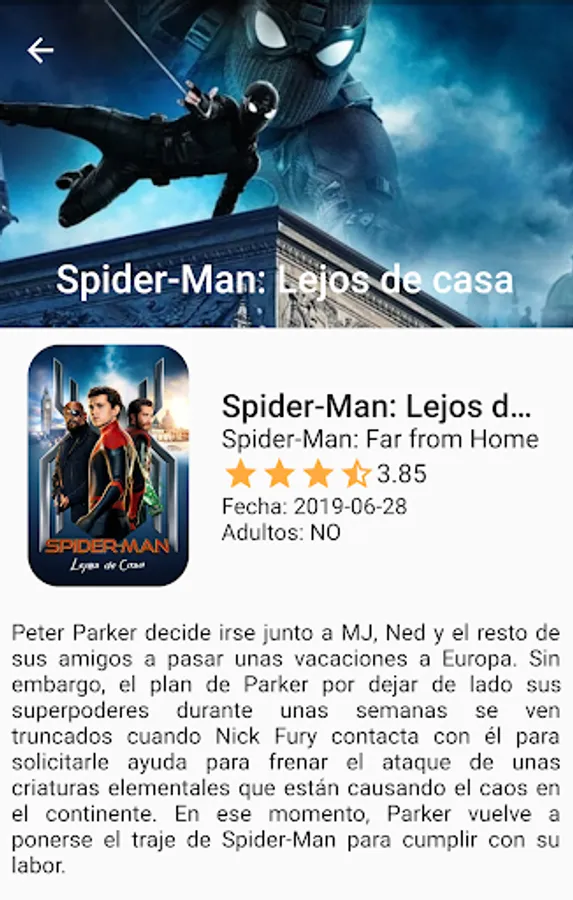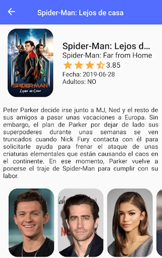 * Detail of the selected film with its classification, score and cast, in addition to the date of publication.