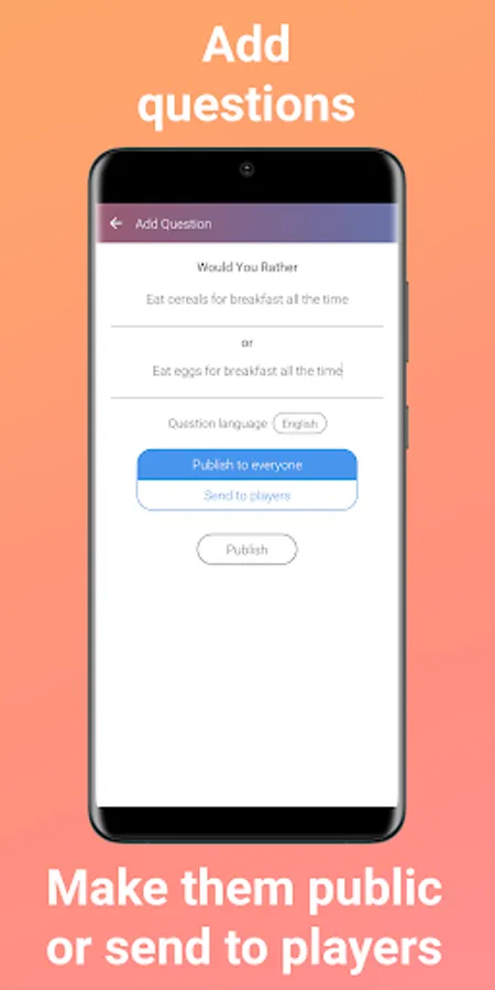 You can also add your own Would You Rather (Either) questions. Each question choice have its own unique number that you can share with your friends and family so they can play that question and see would they rather smash or pass scenario 1 or scenario 2.