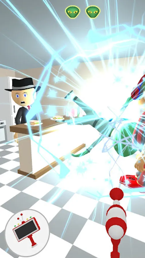 How to know who is among us? Use the blaster and UFO scanner to find the aliens in this imposter game. The imposters replace family members, neighbors, policemen and even road signs. Scan the room and kill an alien hiding among us.