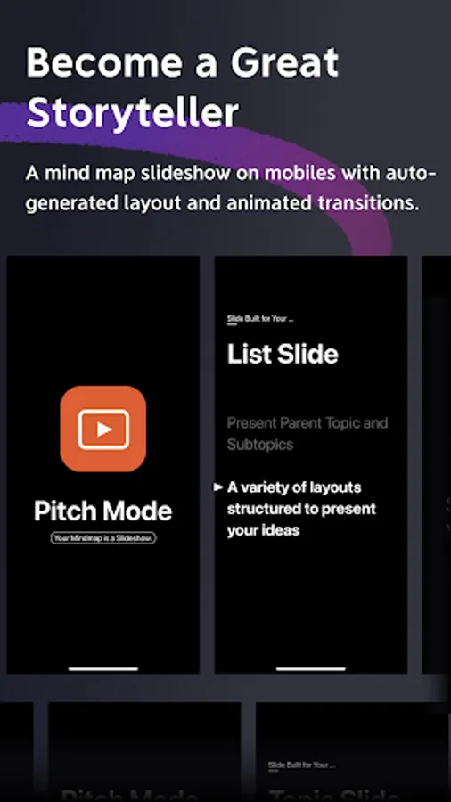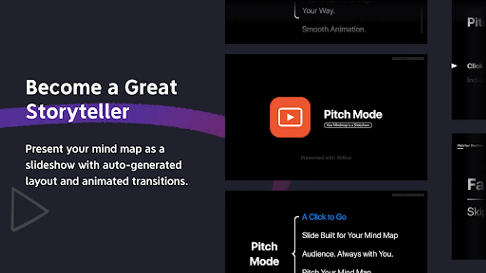 • Pitch Mode: Present mind map as a slideshow with auto-generated transitions and layouts based on your content with just a click.