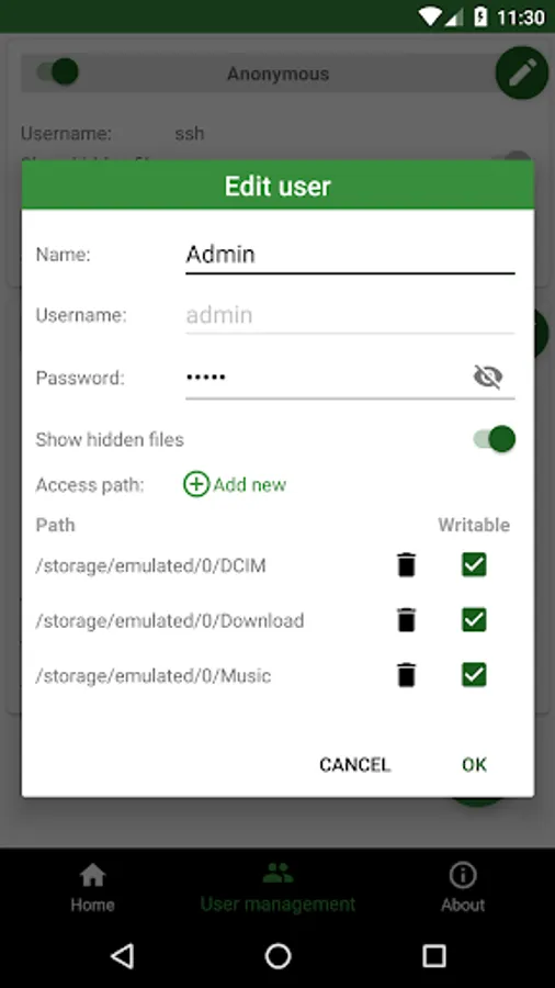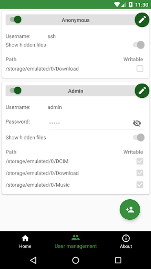 √ [SFTP feature] Multiple access paths for each user: Any folders in your internal storage or external sdcard