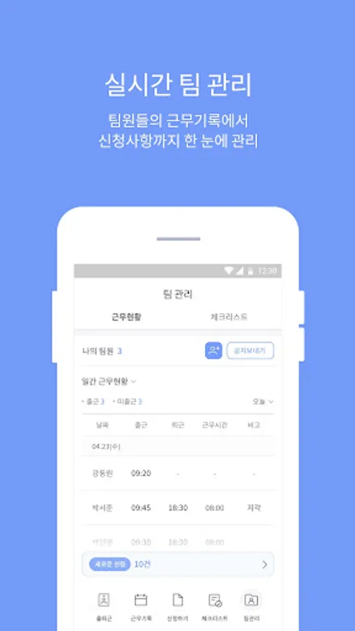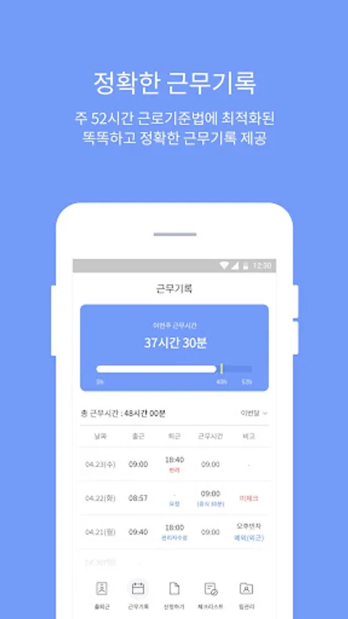 - Managing the working hours is possible by workers(employee) as well as the administrator(or boss) themselves via the monitoring system suited on the Labor Standards Act of 52h/1week.